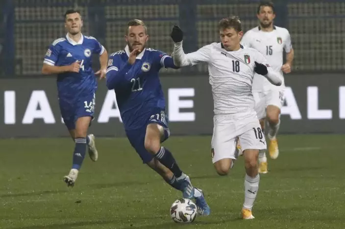 Italy's Nicolo Barella, right, is challenged by Bosnia's Stipe Loncar during the UEFA Nations League soccer match between Bosnia and Italy, in Sarajevo, Bosnia, Wednesday, Nov. 18, 2020. (AP PhotoKemal Softic)
