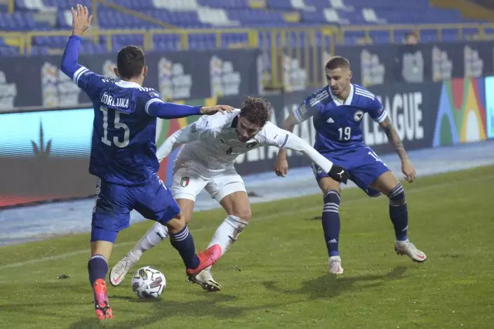 Italy's Manuel Locatelli, center, is challenged by Bosnia's Josip Corluka, left, during the UEFA Nations League soccer match between Bosnia and Italy, in Sarajevo, Bosnia, Wednesday, Nov. 18, 2020. (AP PhotoKemal Softic)