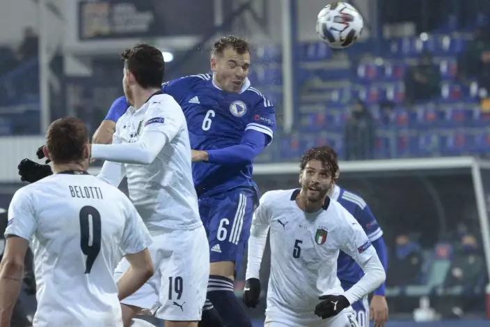 Bosnia's Sinisa Sanicanin, center, heads the ball during the UEFA Nations League soccer match between Bosnia and Italy, in Sarajevo, Bosnia, Wednesday, Nov. 18, 2020. (AP PhotoKemal Softic)