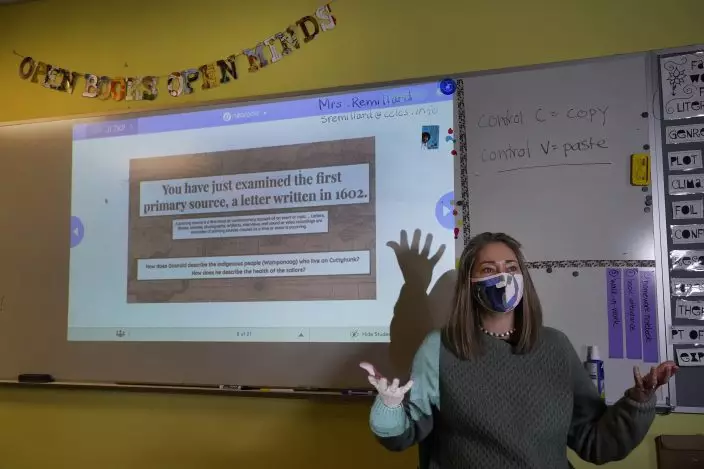 Susannah Remillard speaks in her sixth-grade classroom at Cape Cod Lighthouse Charter School, Thursday, Nov. 19, 2020, in East Harwich, Mass. In a growing number of U.S. schools, students are now learning a more complex Thanksgiving story that involves conflict, injustice and a new focus on the native people who lived in New England for hundreds of years before European settlers arrived. (AP PhotoElise Amendola)
