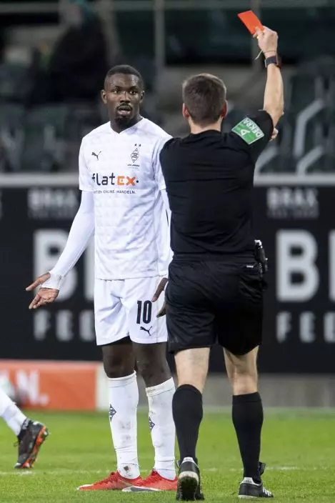 Referee Frank Willenborg shows Moenchengladbach's Marcus Thuram the red card during their German Bundesliga soccer match between Borussia Moenchengladbach and 1899 Hoffenheim at Borussia-Park in Moenchengladbach, Germany, Saturday, Dec. 19, 2020. (Marius Beckerdpa via AP)