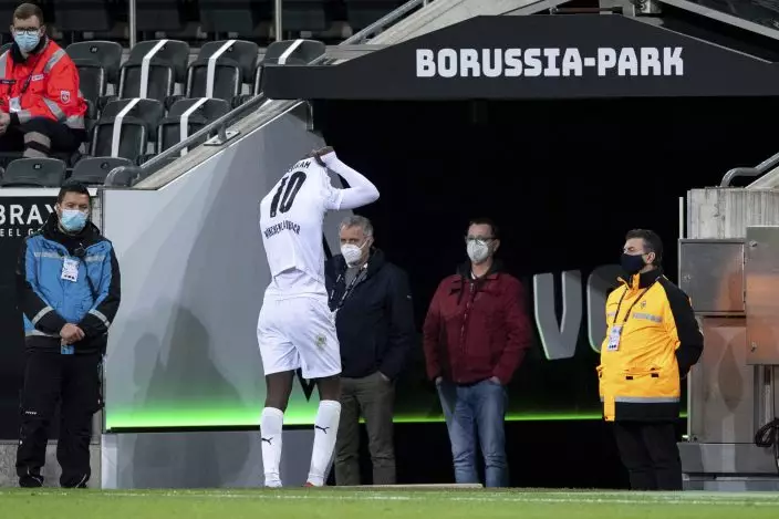 Moenchengladbach's Marcus Thuram leaves the pitch after getting a red card during their German Bundesliga soccer match between Borussia Moenchengladbach and 1899 Hoffenheim at Borussia-Park in Moenchengladbach, Germany, Saturday, Dec. 19, 2020. (Marius Beckerdpa via AP)