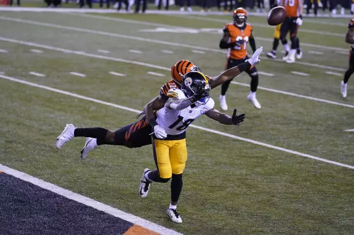 Cincinnati Bengals' William Jackson (22) is called for pass interference against Pittsburgh Steelers' Diontae Johnson (18) during the second half of an NFL football game, Monday, Dec. 21, 2020, in Cincinnati. (AP PhotoMichael Conroy)