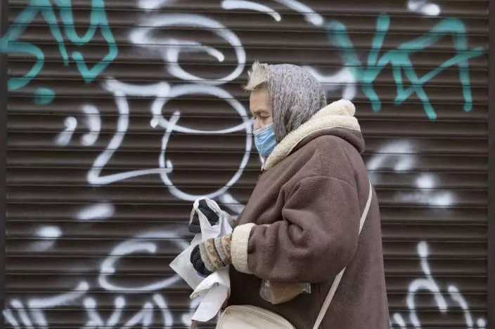 A woman wearing a face mask to protect against coronavirus walks past a closed shop in Ivano-Frankivsk, Western Ukraine, Friday, Jan. 8, 2021. Ukraine imposed a wide-ranging lockdown beginning Friday, closing schools and entertainment venues and restaurant table service through Jan. 25. (AP PhotoEvgeniy Maloletka)
