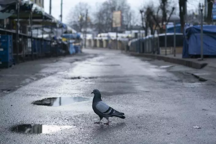A pigeon at a closed street market in Ivano-Frankivsk, Western Ukraine, Friday, Jan. 8, 2021. Ukraine imposes a wide-ranging lockdown beginning Friday, closing schools and entertainment venues and restaurant table service through Jan. 25. (AP PhotoEvgeniy Maloletka)