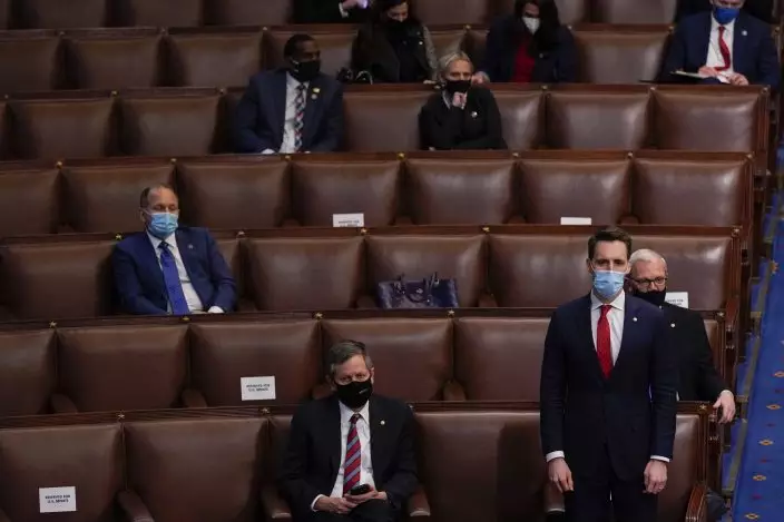 Sen. Josh Hawley, R-Mo., rises to join House Republican members to object to confirming the Electoral College votes from Pennsylvania during a joint session of the House and Senate to confirm the Electoral College votes cast in November's election, at the Capitol, early Thursday, Jan 7, 2021, in Washington. (AP PhotoAndrew Harnik)