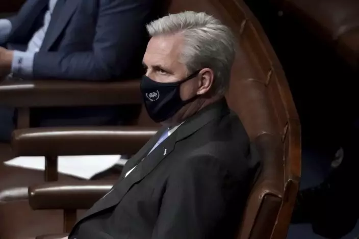 House Minority Leader Kevin McCarthy, R-Calif., looks on in the House Chamber after they reconvened for arguments over the objection of certifying Arizona’s Electoral College votes in November’s election, at the Capitol in Washington, Wednesday, Jan. 6, 2021. (Greg NashPool via AP)