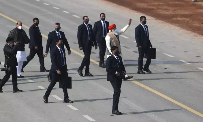 Indian Prime Minister Narendra Modi, red cap, waves as he returns after India's Republic Day celebrations in New Delhi, India, Tuesday, Jan.26, 2021. Republic Day marks the anniversary of the adoption of the country's constitution on Jan. 26, 1950. (AP PhotoManish Swarup)