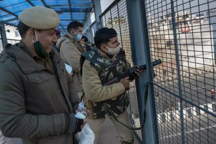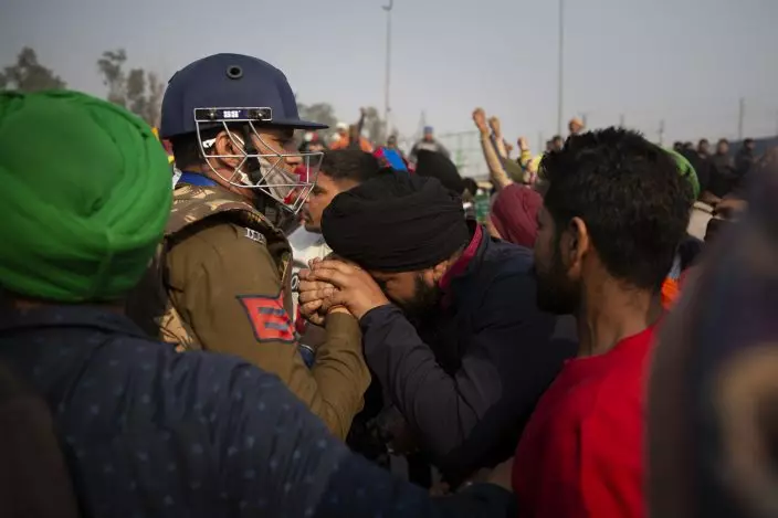 A protesting farmer pleads in front of a police officer to let them pass through a barricade at at the Delhi-Uttar Pradesh state border, India, Tuesday, Jan. 26, 2021. Tens of thousands of farmers drove a convoy of tractors into the Indian capital as the nation celebrated Republic Day on Tuesday in the backdrop of agricultural protests that have grown into a rebellion and rattled the government. (AP PhotoAltaf Qadri)