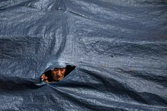 An elderly protesting farmer looks through a hole in a tarpaulin covering the tractor trolley as they march to the capital during India's Republic Day celebrations in New Delhi, India, Tuesday, Jan. 26, 2021. Tens of thousands of farmers drove a convoy of tractors into the Indian capital as the nation celebrated Republic Day on Tuesday in the backdrop of agricultural protests that have grown into a rebellion and rattled the government. (AP PhotoAltaf Qadri)