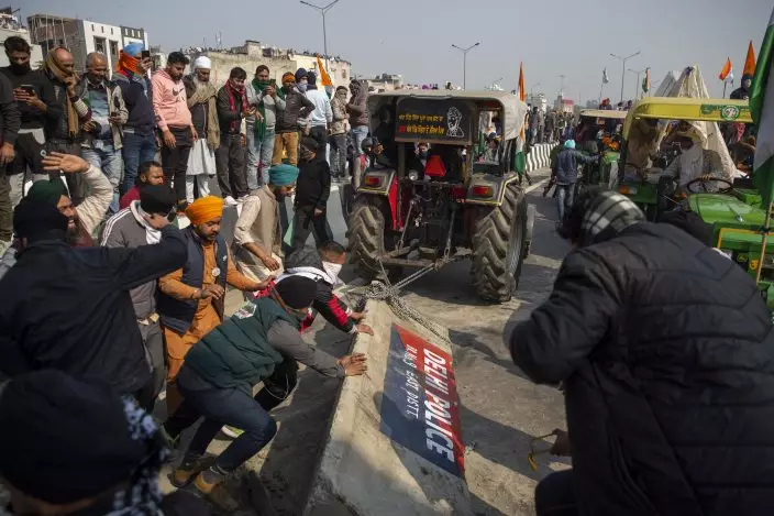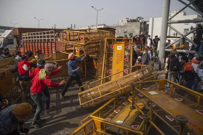 Protesting farmers remove police barricades as they march to the capital during India's Republic Day celebrations in New Delhi, India, Tuesday, Jan. 26, 2021. Tens of thousands of farmers drove a convoy of tractors into the Indian capital as the nation celebrated Republic Day on Tuesday in the backdrop of agricultural protests that have grown into a rebellion and rattled the government. (AP PhotoAltaf Qadri)