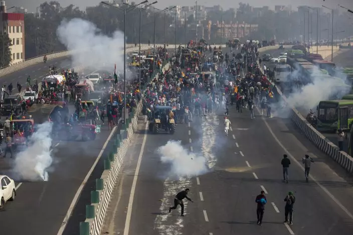 Riot police fired tear gas and water cannons and set up barricades in attempt to hold back the protesters Tuesday. The farmers have been demanding the withdrawal of new laws that they say will favor large corporate farms and devastate the earnings of smaller scale farmers.