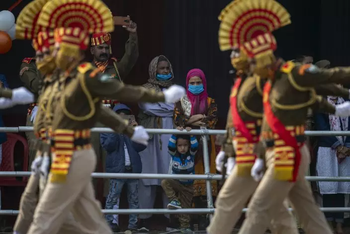 People watchIndian paramilitary Sasastra Seema Bal personnel march during India's Republic Day celebration in Gauhati, India, Tuesday, Jan. 26, 2021. Republic Day marks the anniversary of the adoption of the country's constitution on Jan. 26, 1950. (AP PhotoAnupam Nath)