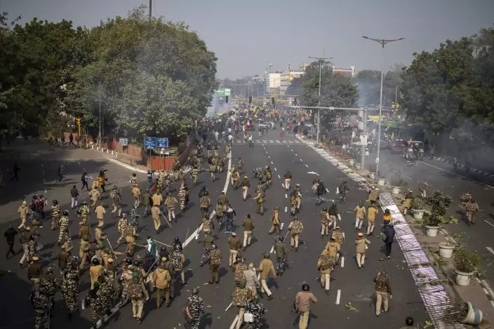 Indian police chase protesting farmers away as they march to the capital breaking police barricades during India's Republic Day celebrations in New Delhi, India, Tuesday, Jan. 26, 2021. Tens of thousands of farmers drove a convoy of tractors into the Indian capital as the nation celebrated Republic Day on Tuesday in the backdrop of agricultural protests that have grown into a rebellion and rattled the government. (AP PhotoAltaf Qadri)