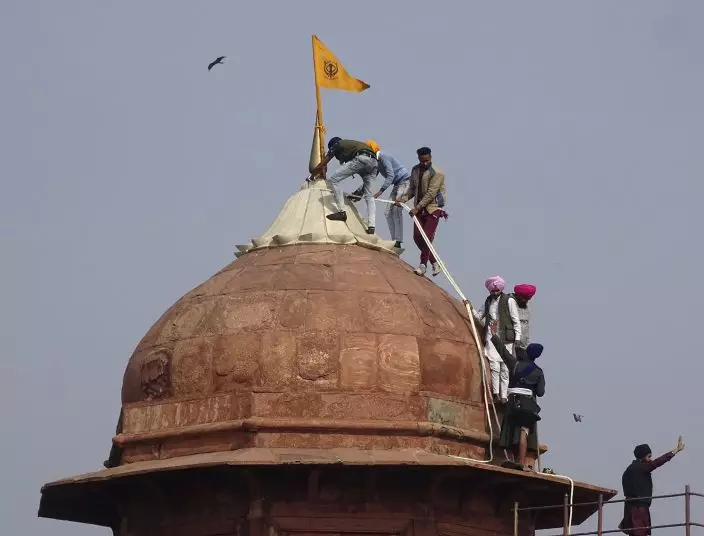 Sikhs hoist a Nishan Sahib, a Sikh religious flag, on a minaret of the historic Red Fort monument in New Delhi, India, Tuesday, Jan. 26, 2021. Tens of thousands of protesting farmers drove long lines of tractors into India's capital on Tuesday, breaking through police barricades, defying tear gas and storming the historic Red Fort as the nation celebrated Republic Day. (AP PhotoDinesh Joshi)