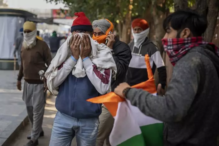 Protesting farmers cover their faces to escape tear gas smoke as they march to the capital breaking police barricades during India's Republic Day celebrations in New Delhi, India, Tuesday, Jan. 26, 2021. Tens of thousands of farmers drove a convoy of tractors into the Indian capital as the nation celebrated Republic Day on Tuesday in the backdrop of agricultural protests that have grown into a rebellion and rattled the government. (AP PhotoAltaf Qadri)