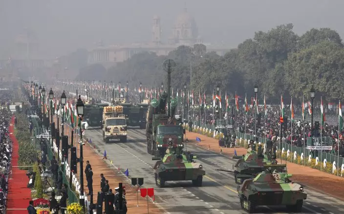 Battle tanks move through the ceremonial Rajpath boulevard during India's Republic Day celebrations in New Delhi, India, Tuesday, Jan. 26, 2021. Republic Day marks the anniversary of the adoption of the country's constitution on Jan. 26, 1950. (AP PhotoManish Swarup)