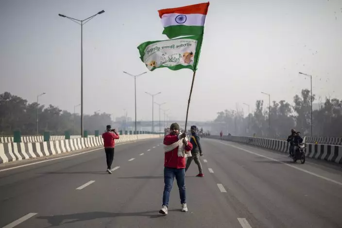 A protesting farmer waves an Indian flag and a farmer union flag as he marches with others to the capital breaking police barricades during India's Republic Day celebrations in New Delhi, India, Tuesday, Jan. 26, 2021. Tens of thousands of farmers drove a convoy of tractors into the Indian capital as the nation celebrated Republic Day on Tuesday in the backdrop of agricultural protests that have grown into a rebellion and rattled the government. (AP PhotoAltaf Qadri)