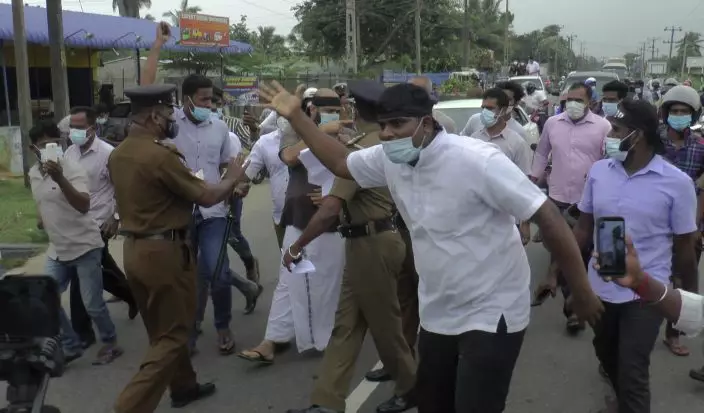 Police try to stop supporters of Sri Lanka's Tamil National Alliance parading in Addalaichenai, Sri Lanka, Wednesday, Feb. 3, 2021.Sri Lanka's ethnic Tamil leaders and civilians started a four-day protest parade from the east to the north on Wednesday to coincide with the country's 73rd independence anniversary, demanding justice for civilians killed and forcibly disappeared allegedly at the hands of the government military.(AP PhotoAchala Upendra)