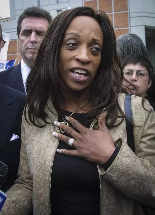 FILE - This Saturday May 26, 2001 file photo shows Kathy Jordan Sharpton as she meets with supporters following a visit to her husband the Rev. Al Sharpton at the Metropolitan Detention Center in the Brooklyn, N.Y. More than 16 years after separating, Rev. Al Sharpton has filed for divorce from his estranged wife, Kathy Jordan Sharpton. (AP PhotoShawn Baldwin, File)