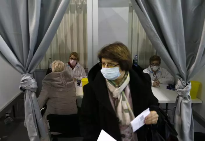 Health workers speak with people at a vaccination center in Belgrade, Serbia, Wednesday, Feb. 17, 2021. Serbia, a country of 7 million, has so far vaccinated some 1 million people, mainly with the Chinese Sinopharm vaccine and Russian Sputnik V, and to a lesser extent with the Pfizer jab. (AP PhotoDarko Vojinovic)