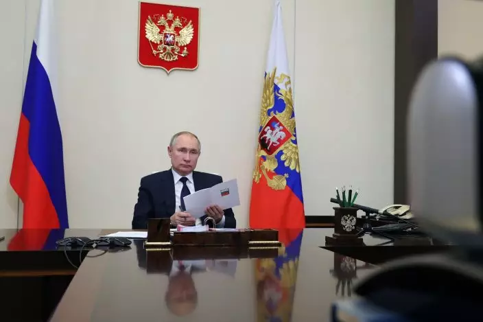 Russian President Vladimir Putin attends a meeting with leaders of the State Duma, the Lower House of the Russian Parliament factions via video conference residence at the Novo-Ogaryovo outside Moscow, Russia, Wednesday, Feb. 17, 2021. (Mikhail Klimentyev, Sputnik, Kremlin Pool Photo via AP)