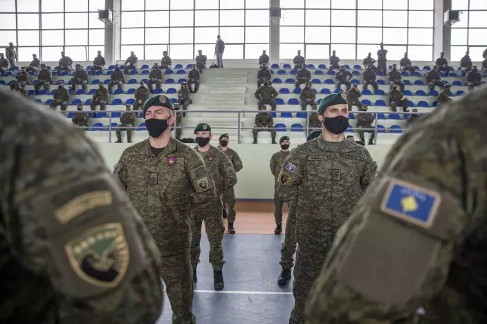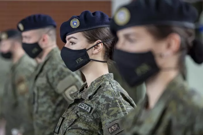 Kosovo Security Force (KSF) members wearing protective face masks line up during a peacekeeping mission deployment ceremony held at the army barracks in Pristina, Tuesday, March 9, 2021. Kosovo is sending a military platoon to Kuwait, its first ever involvement in an international peacekeeping mission. A ceremony was held Tuesday at the army barracks in the capital, Pristina, with the presence of top country leaders and western military attaches. Kosovo is sending the military unit following a request from the U.S. Central Command. (AP PhotoVisar Kryeziu)