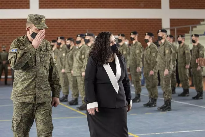 Kosovo acting President Vjosa Osmani, center, flanked by Kosovo Security Force commander Rrahman Rama, left, reviews Kosovo Security Force (KSF) members, during a peacekeeping mission deployment ceremony, held at the army barracks in Pristina, Tuesday, March 9, 2021. Kosovo is sending a military platoon to Kuwait, its first ever involvement in an international peacekeeping mission. A ceremony was held Tuesday at the army barracks in the capital, Pristina, with the presence of top country leaders and western military attaches. Kosovo is sending the military unit following a request from the U.S. Central Command. (AP PhotoVisar Kryeziu)