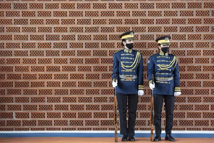 Kosovo Security Force honor guard stand, during a peacekeeping mission deployment ceremony, held at the army barracks in Pristina, Tuesday, March 9, 2021. Kosovo is sending a military platoon to Kuwait, its first ever involvement in an international peacekeeping mission. A ceremony was held Tuesday at the army barracks in the capital, Pristina, with the presence of top country leaders and western military attaches. Kosovo is sending the military unit following a request from the U.S. Central Command. (AP PhotoVisar Kryeziu)