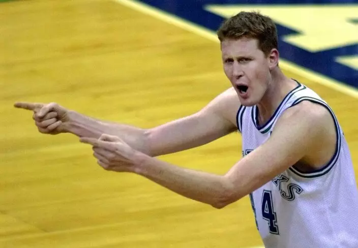 FILE - In this Feb. 17, 2001, file photo, Dallas Mavericks center Shawn Bradley reacts as he argues a defensive foul he was charged with during the second quarter of an NBA basketball game against the Washington Wizards in Dallas. Former NBA player Shawn Bradley was paralyzed when he was struck from behind by a vehicle while riding a bike near his Utah home, saying in a statement nearly two months after the accident he intended to bring awareness to bicycle safety. (AP PhotoBill Janscha)