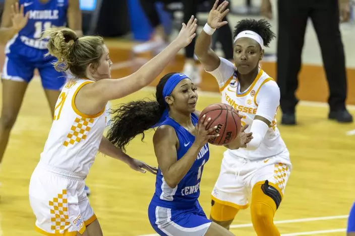 Tennessee guard Jordan Walker, center, goes to the basket between Middle Tennessee State forward Courtney Whitson and guard Anastasia Hayes during the first half of a college basketball game in the first round of the women's NCAA basketball tournament at the Frank Erwin Center in Austin, Texas, Sunday, March 21, 2021. (AP PhotoStephen Spillman)