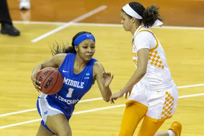 Middle Tennessee State guard Anastasia Hayes, left, drives around Tennessee guard Rae Burrell during the first half of a college basketball game in the first round of the women's NCAA basketball tournament at the Frank Erwin Center in Austin, Texas, Sunday, March 21, 2021. (AP PhotoStephen Spillman)