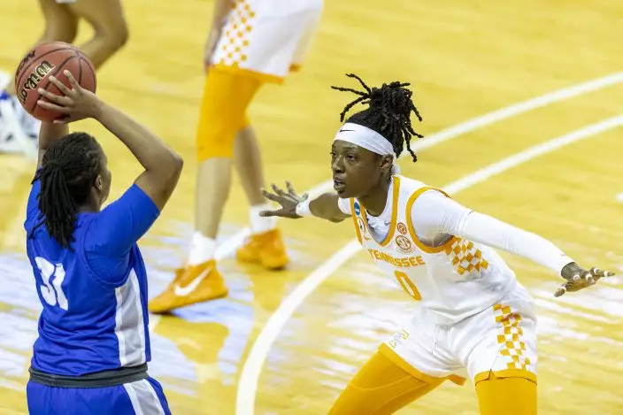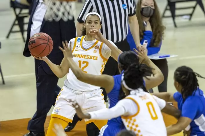 Tennessee guard Rae Burrell, top, looks to pass to guard Rennia Davis (0) during the first half of a college basketball game against Middle Tennessee State in the first round of the women's NCAA basketball tournament at the Frank Erwin Center in Austin, Texas, Sunday, March 21, 2021. (AP PhotoStephen Spillman)