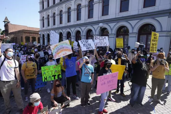 Demonstrators rally against Asian hate crimes in El Pueblo de Los Angeles, Los Angeles Plaza Park, Saturday, March 27, 2021. Asian Americans and their allies held rallies Saturday in California, home of the nation's largest Asian population, to denounce shootings at massage businesses in Georgia and racism, xenophobia and misogyny. (AP PhotoDamian Dovarganes)