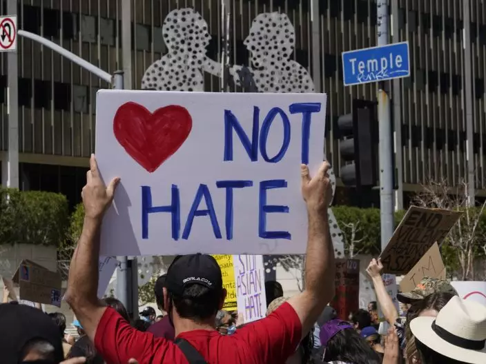 Intarah Igama, 24, a first generation American from the Bay Area in California holds a sign near the silhouette art piece named "Molecule Man" in front of the Edward Roybal Federal Building, at a rally against Asian hate crimes, Saturday, March 27, 2021 downtown Los Angeles. The gathered crowd demanded justice for the victims of the Atlanta spa shooting and for an end to racism, xenophobia and misogyny. (AP Photo (AP PhotoDamian Dovarganes)