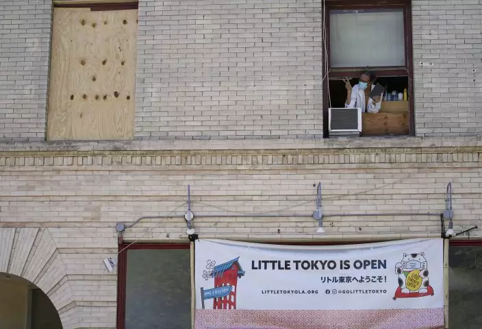 Little Tokyo resident Richard Duvalier peaks out his second floor window to express his support to demonstrators marching at a rally against Asian hate crimes, Saturday, March 27, 2021 downtown Los Angeles. The gathered crowd demanded justice for the victims of the Atlanta spa shooting and for an end to racism, xenophobia and misogyny. (AP Photo (AP PhotoDamian Dovarganes)