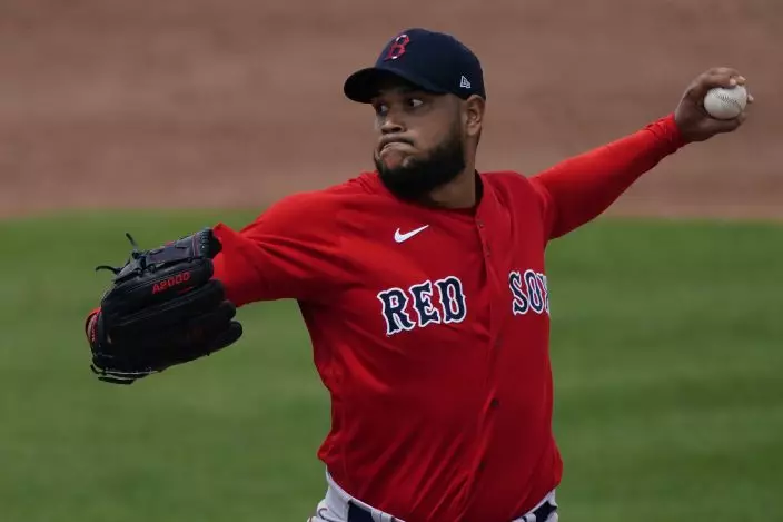 Boston Red Sox starting pitcher Eduardo RodrÃguez (57) works against the Minnesota Twins in the second inning of a spring training baseball game, Thursday, March 11, 2021, in Fort Myers, Fla.. (AP PhotoJohn Bazemore)