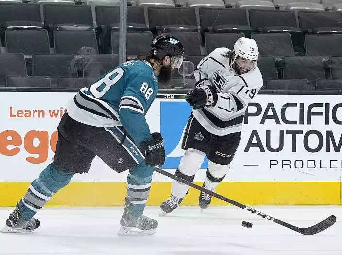 Los Angeles Kings right wing Alex Iafallo (19) takes a shot at goal past San Jose Sharks defenseman Brent Burns (88) during the second period of an NHL hockey game Friday, April 9, 2021, in San Jose, Calif. (AP PhotoTony Avelar)