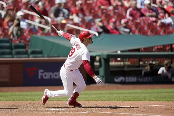 St. Louis Cardinals' Nolan Arenado doubles during the sixth inning of a baseball game against the Washington Nationals Wednesday, April 14, 2021, in St. Louis. (AP PhotoJeff Roberson)