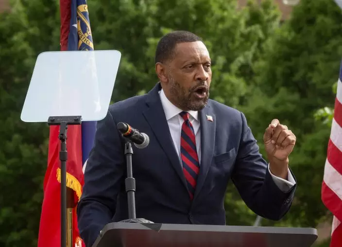 Vernon Jones declares his intention to run for governor of Georgia as a Republican in Atlanta, on Friday, April 16, 2021. Jones, a former Democrat, is looking to ride a wave of Trump supporters' discontent with Gov. Brian Kemp to the Republican nomination. (AP PhotoRon Harris)