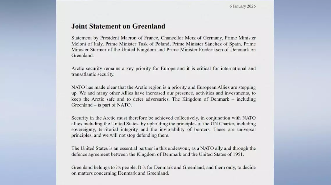 The statement noted that the Kingdom of Denmark, including Greenland, is part of NATO, and said security in the Arctic must be achieved collectively with NATO allies, including the United States, by upholding the principles of the UN Charter, including sovereignty, territorial integrity and the inviolability of borders.
