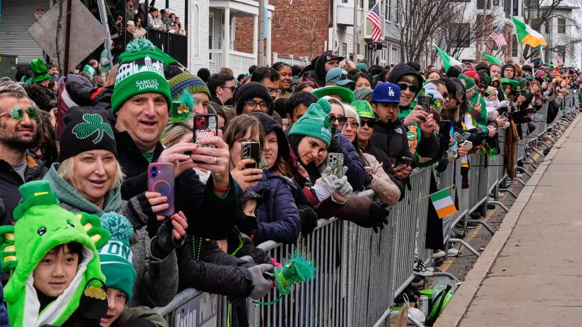 Spectators line up on Dorchester Avenue during the annual St. Patrick's Day parade through the South Boston neighborhood, Sunday, March 15, 2026, in Boston. (AP Photo/Charles Krupa)