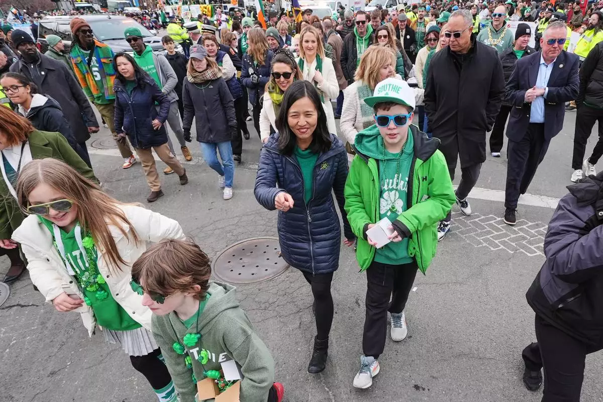Boston Mayor Michelle Wu, center, marches through Andrew Square during the annual St. Patrick's Day parade through the South Boston neighborhood, Sunday, March 15, 2026, in Boston. (AP Photo/Charles Krupa)