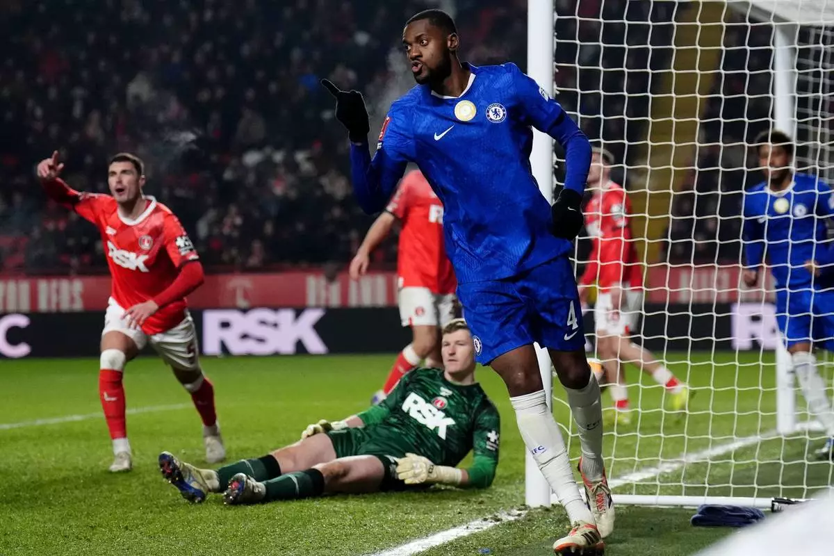 Chelsea's Tosin Adarabioyo celebrates scoring his team's second goal of the game during the English FA Cup third round soccer match between Charlton Athletic and Chelsea in London, Saturday Jan. 10, 2026. (John Walton/PA via AP)