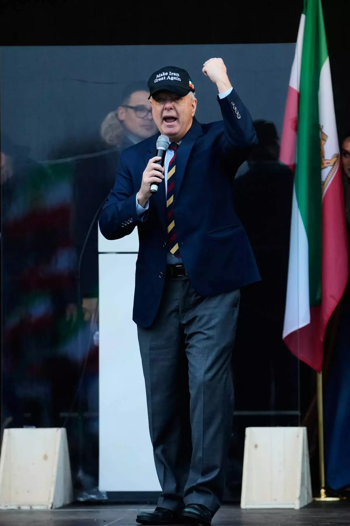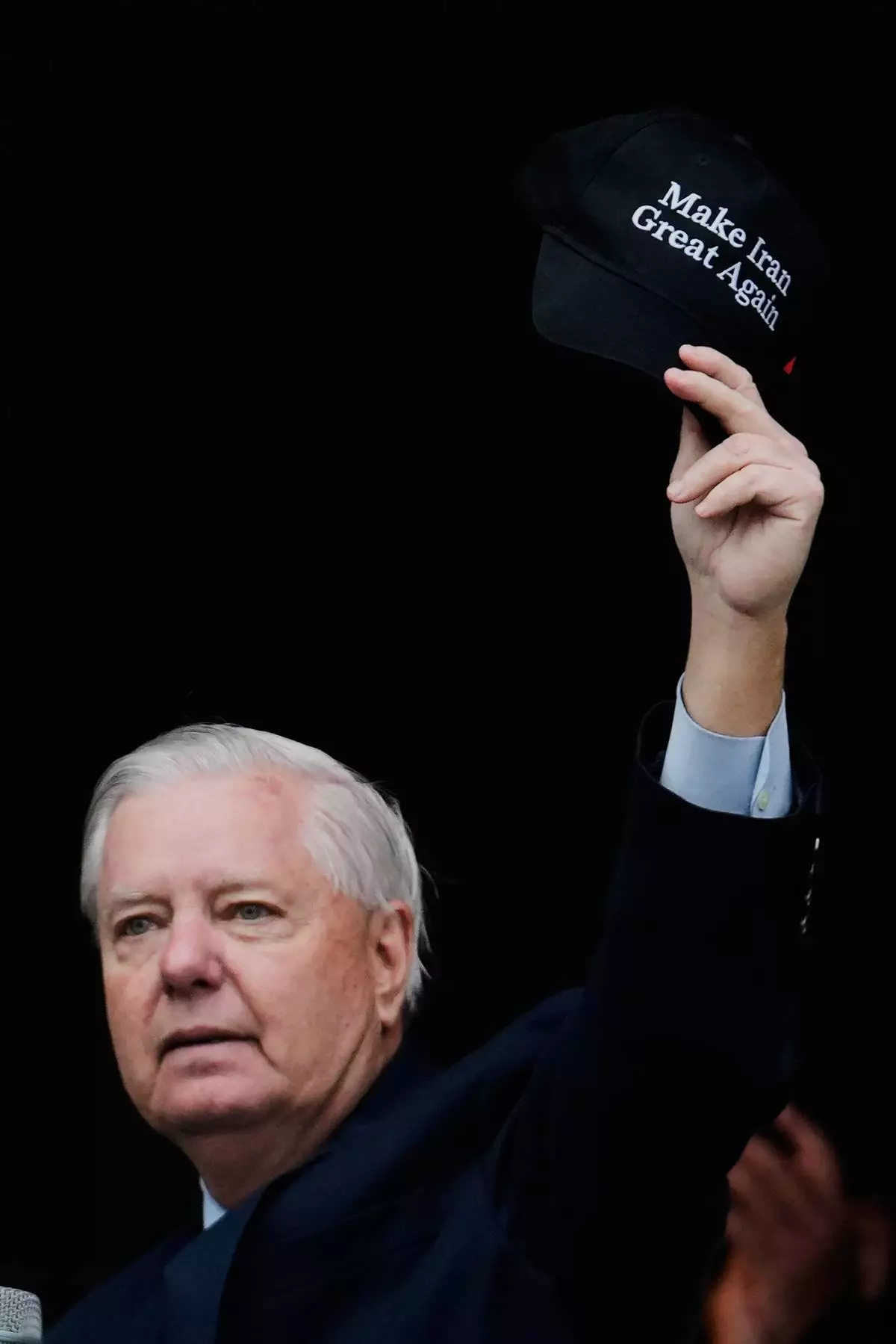 At the Munich rally, demonstrators sported “Make Iran Great Again" red caps, mimicking the MAGA caps worn by U.S. President Donald Trump 's supporters. Among those sporting the caps was U.S. Senator Lindsey Graham, who gave a speech to the crowd during which he held up a cap.
