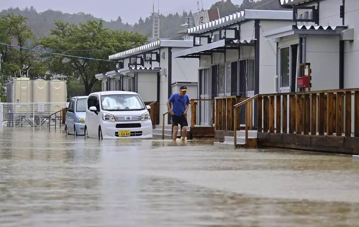 A man wades through a flooded street near temporary housing units installed after the Jan. 1 earthquake in Wajima, Japan, Sunday, Sept. 22, 2024, following heavy rain in central Japan's Noto peninsula area, where a devastating earthquake took place on Jan. 1. (Muneyuki Tomari/Kyodo News via AP)