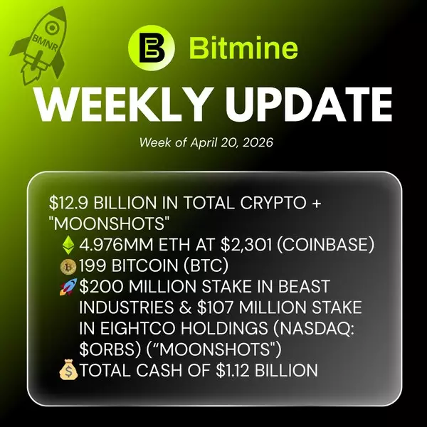 NORWALK, Conn., April 20, 2026 /PRNewswire/ -- (NYSE: BMNR) Bitmine Immersion Technologies, Inc. ("Bitmine" or the "Company") a Bitcoin and Ethereum Network company with a focus on the accumulation of crypto for long term investment, today announced Bitmine crypto + total cash + "moonshots" holdings totaling $12.9 billion.