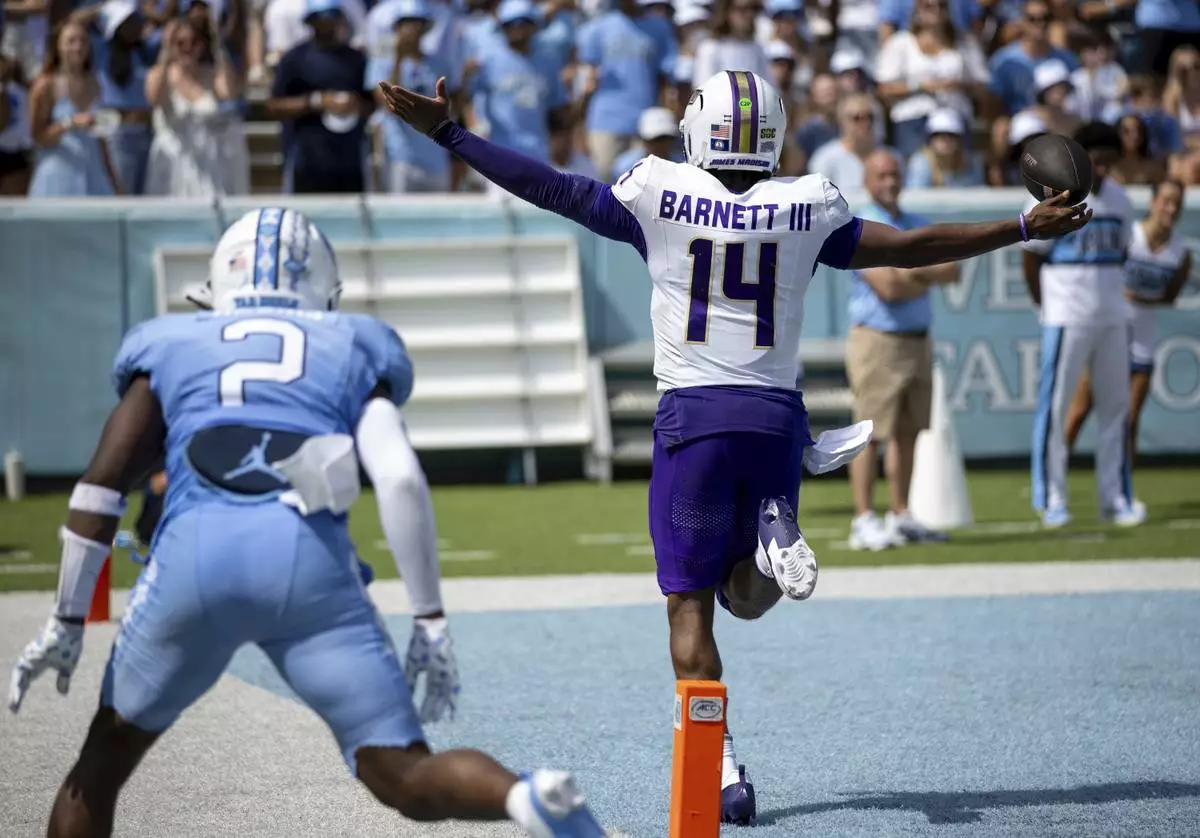 James Madison quarterback Alonza Barnett III (14) celebrates after running in a touchdown during the first half of an NCAA college football game against North Carolina in Chapel Hill, N.C., Saturday, Sept. 21, 2024. (Daniel Lin/Daily News-Record via AP)