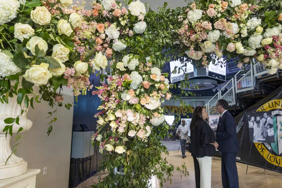 A wall of flowers by Hiram Smith of HiramStyle Flowers and Production greets family and guests entering Xavier University of Louisiana's convocation center for a Celebration of Life for Sybil Haydel Morial, Monday, Sept. 23, 2024, in New Orleans. (Chris Granger/The Times-Picayune/The New Orleans Advocate via AP)