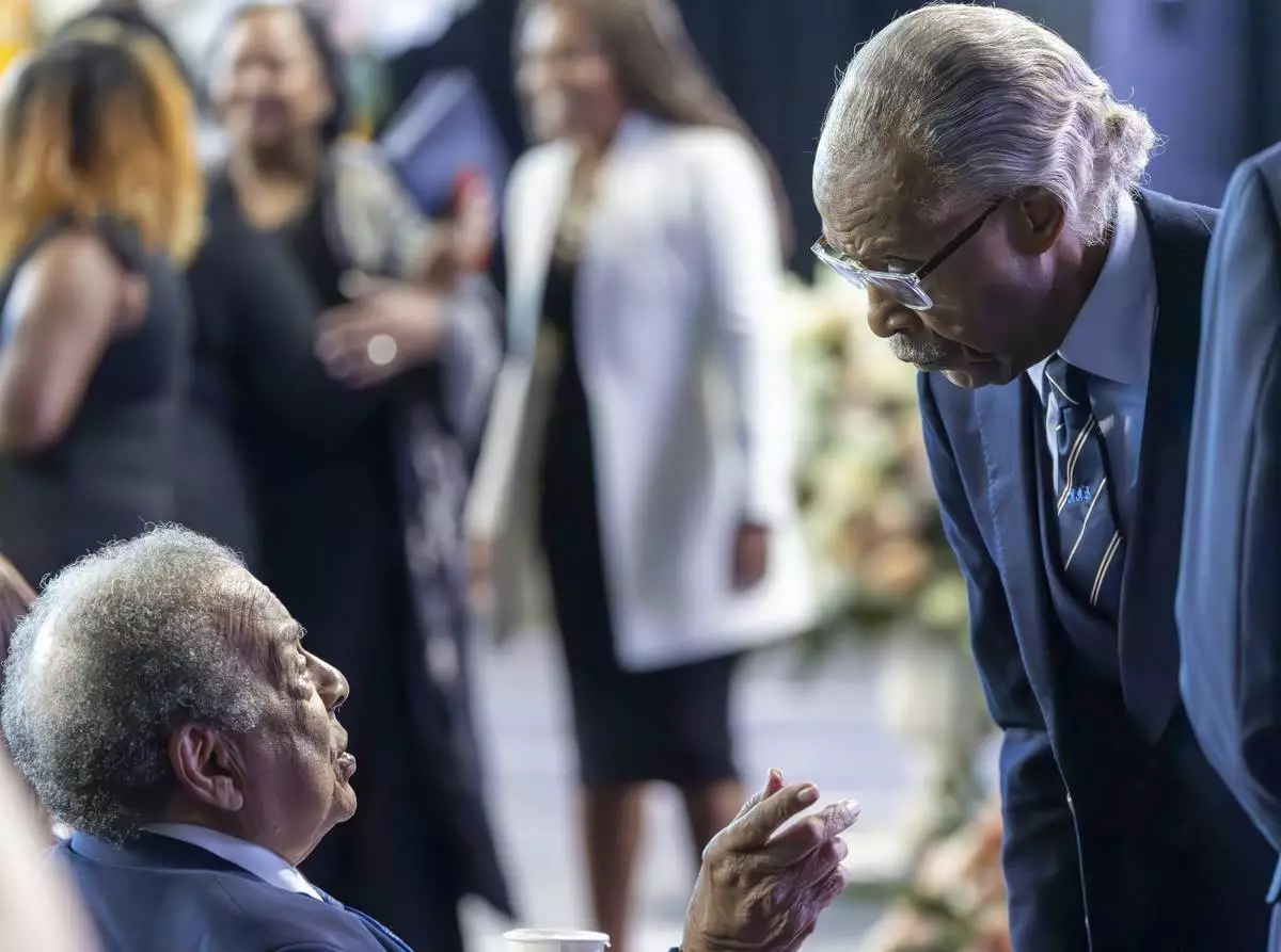 Former United States Ambassador to the United Nations Andrew Young Jr., bottom left, talks with Rev. Al Sharpton, right, founder and CEO of National Action Network, before the start of the Celebration of Life for Sybil Haydel Morial at Xavier University of Louisiana, Monday, Sept. 23, 2024, in New Orleans. (Chris Granger/The Times-Picayune/The New Orleans Advocate via AP)